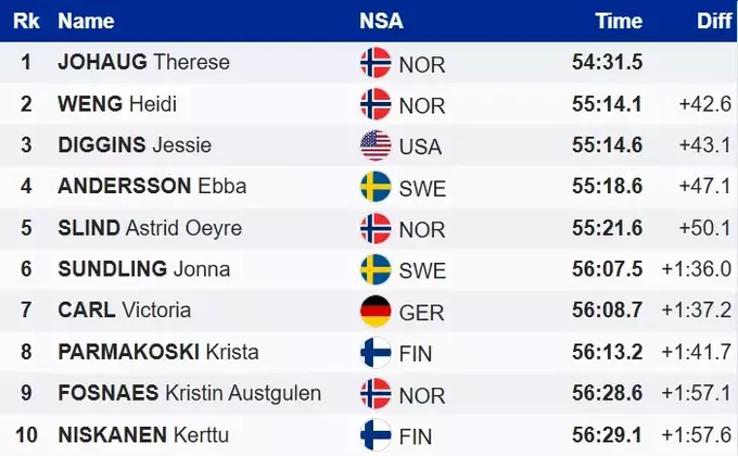 Вторую победу текущего сезона в актив записала норвежка Тереза Йохауг. Легендарная лыжница финишировала первой с общим временем 54:31.5 минуты.