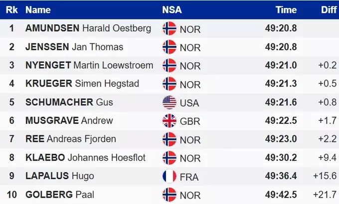 В топ-3 вошли представители Норвегии. Второй – Ян Томас Йенссен, а третьим прибежал чемпион предварительного старта Мартин Лёвстрём Ньенгет.