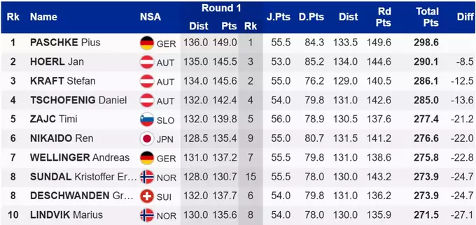 Имея в активе 298.6 балла, первое место занял немецкий спортсмен Пьюс Пашке, для которого эта победа стала третьей в рамках этого сезона Кубка мира.