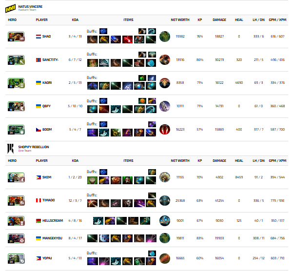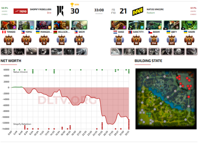 На второй карте сценарий выглядел схожим, однако в этот раз игра длилась чуть дольше – 33:08. Shopify Rebellion играли на стороне Dire и победили со счетом 30:21. Хоть начало игры были довольно неплохим для наших ребят, график Net Worth демонстрирует резкий спад для Natus Vincere после ставшей решающим моментом середины игры.