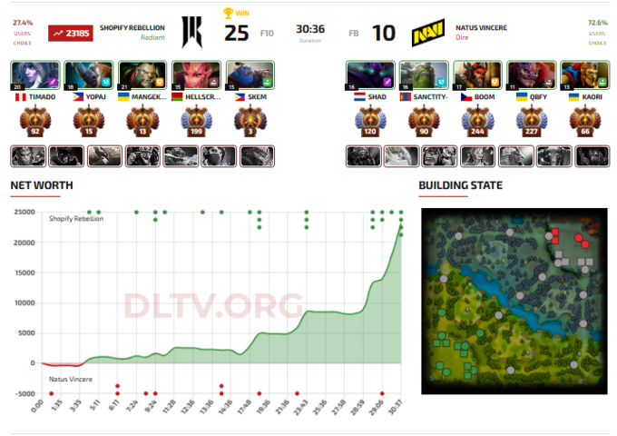 На первой карте Shopify Rebellion продемонстрировали уверенную игру, разгромив соперника со счетом 25:10 за 30 минут 36 секунд. Благодаря удачному драфту и командной координации, они смогли захватить контроль над игрой, что хорошо видно из стремительно возраставшего в их пользу графика Net Worth.