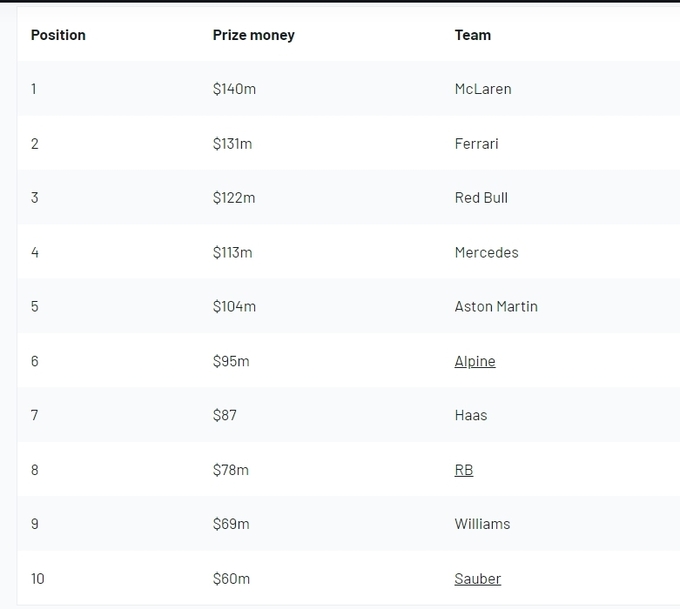 По итогам сезона-2024 в Формуле-1 больше всех призовых заработала команда Макларен, которая выиграла Кубок конструкторов. Британцы получат от Ф-1 140 миллионов долларов.