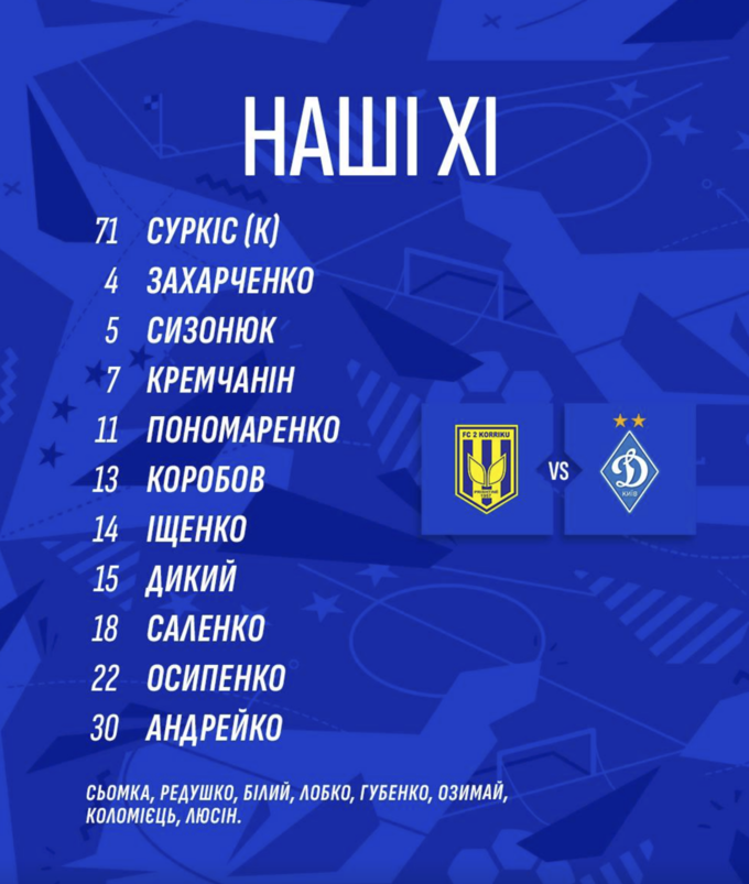 Динамо: Суркис, Коробов, Сизонюк, Захарченко, Дикий, Ищенко, Саленко, Осипенко, Кремчанин, Андрейко, Пономаренко