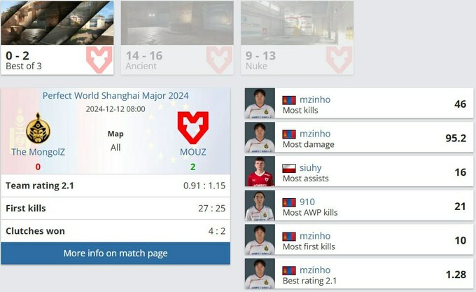 MOUZ не могли вообразить худшего старта на первой карте, Ancient. Они потеряли преимущество 2v4 в пистолетном раунде и проиграли первый полноценный раунд после 1v3 клатча от Аюш «mzinho» Батболд. 17-летний талант из The MongolZ набрал 18 фрагов в первой половине, обеспечив своей команде преимущество 9:3.