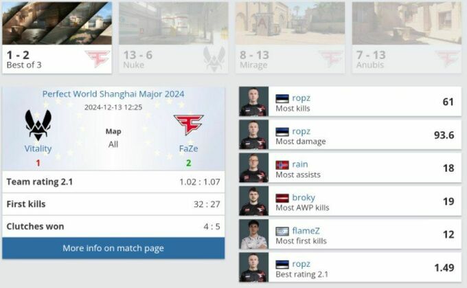 Все решалось на карте Anubis, где FaZe быстро захватили контроль над игрой. Vitality допустили карту, на которой сами испытывали сложности, и FaZe использовали это в полной мере. Начав на стороне защиты, FaZe завершили первую половину с преимуществом в четыре раунда, а ropz вновь продемонстрировал высокий уровень игры. Vitality смогли взять только три раунда во второй половине, но FaZe уверенно довели матч до победы – 13:7.