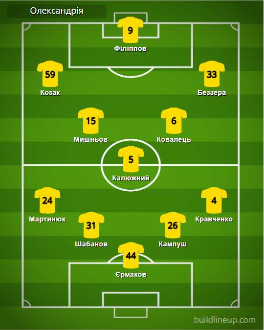 «Александрия»: Ермаков – Мартынюк, Шабанов, Кампуш, Кравченко – Мишнев (Шостак, 74), Калюжный (Ващенко, 89), Ковалец (Кулаков, 89) – Козак (Беляев, 74), Филиппов (Костышин, 90+5), Безерра.