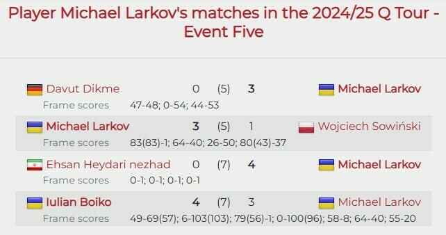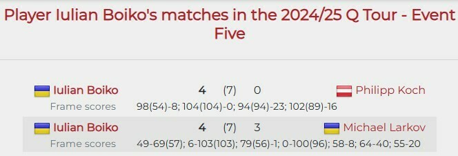 Украинский снукерист Юлиан Бойко вышел в 1/8 финала 5-го турнира аматорской серии Q Tour сезона 2024/25, который проходит в Вене, столице Австрии.