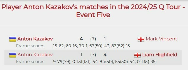 Другой украинец Антон Казаков, ранее имевший статут профи, переиграл Марка Винсента из Англии (4:0), а затем в 1/16 финала уступил англичанину Лиаму Хайдфилду (1:4).