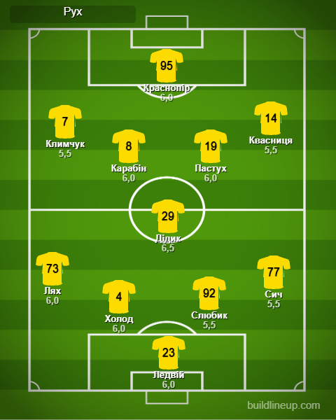 «Рух»: Ледвий – Лях, Холод, Слюбик, Сыч – Дидык – Карабин, Пастух – Климчук (Федор, 57), Квасница (Клайвер, 67) Краснопир