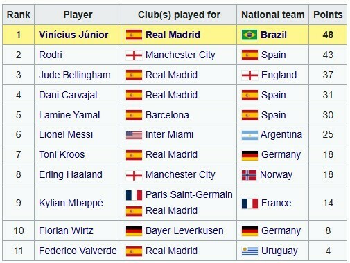 - 1. Винисиус Жуниор (Бразилия, Реал Мадрид) – 48 очков