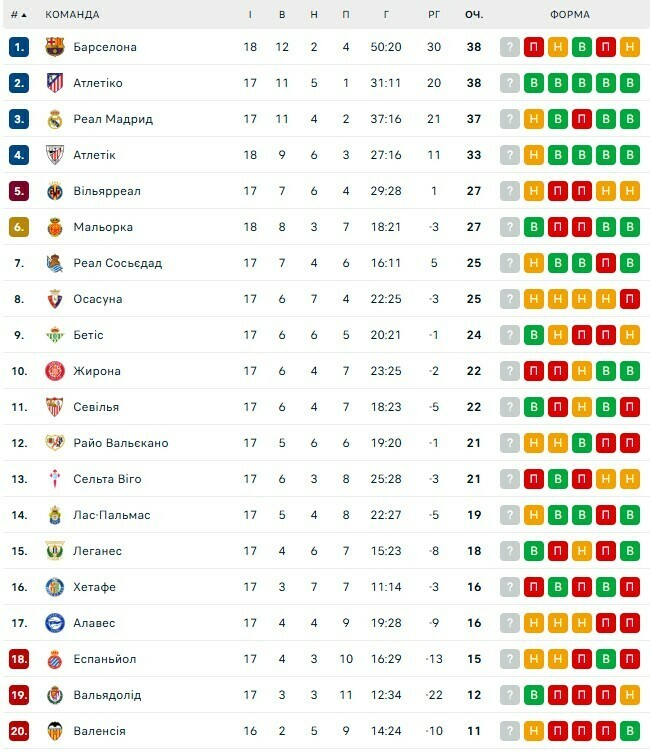 Вильярреал входит в топ-5, а Эспаньол и Валенсия находятся в зоне вылета.