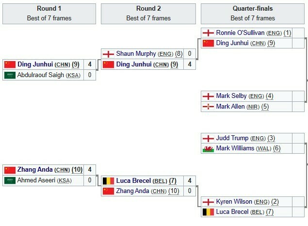 19 декабря в 1/4 финала сыграют: Марк Селби – Марк Аллен, Кайрен Уилсон – Люка Бресель, Джадд Трамп – Марк Уильямс, Ронни O'Салливан – Дин Цзюньхуэй.