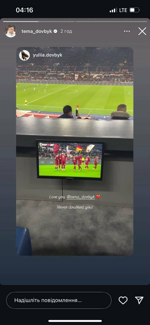 Жена нападающего «Ромы» и сборной Украины Артема Довбика, Юлия, опубликовала сторис после одного из голов мужа в матче 1/8 финала Кубка Италии «Рома» - «Сампдория» (4:1).