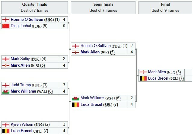 20 декабря в 1/2 финала знаменитый английский снукерист Ронни O'Салливан проиграл Марку Аллену из Северной Ирландии (2:4), а Марк Уильямс из Уэльса уступил Люке Бреселю из Бельгии (2:4).