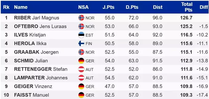 Третью личную победу в сезоне одержал Ярл Магнус Риибер, которому удалось опередить ближайшего соперника на 1.5 балла. Второе место занял другой представитель Норвегии Йенс Лурос Офтебро. Третья ступенька за эстонцем Кристьяном Илвесом.