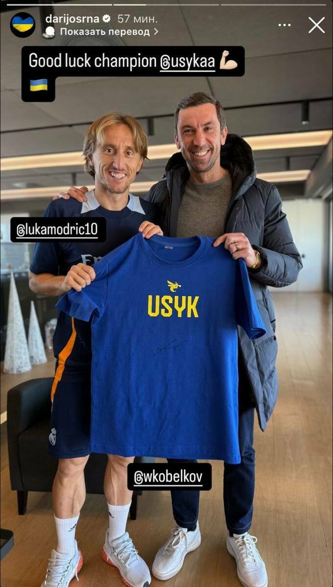 Спортивный директор донецкого «Шахтера» Дарио Срна вместе со звездным полузащитником мадридского «Реала» Лукой Модричем поддержали украинского боксера Александра Усика перед боем с Тайсоном Фьюри.