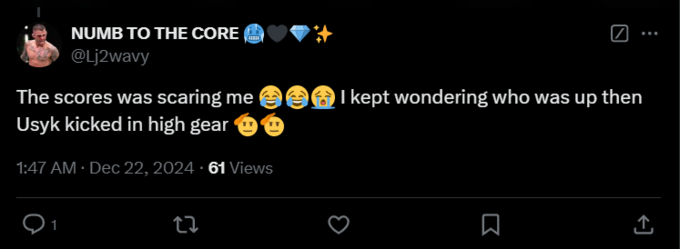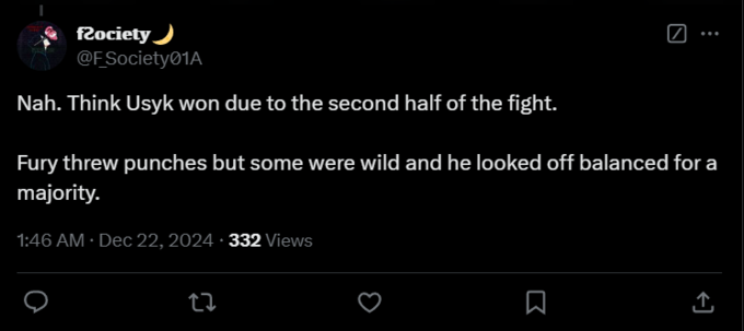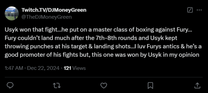 DJMoneyGreen: «Усик просто выдал мастер-класс против Фьюри. С 7-го и 8-го раунда Фьюри вообще не мог толком попасть, а Усик всё время попадал в цель и продолжал контролировать бой. Мне нравятся выходки Фьюри, он реально крутой промоутер и шоу-мен, но, честно говоря, этот бой полностью выиграл Усик».
