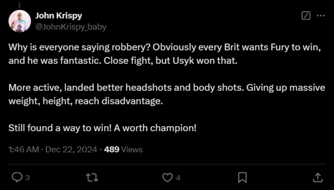 John Krispy: «Почему все говорят о грабеже? Очевидно, что каждый британец хочет, чтобы Фьюри победил, но Усик был великолепен. Это был бой в ближнем бою, но Усик явно выиграл. Он был более активным, наносил лучшие удары в голову и корпус, несмотря на огромный недостаток в весе, росте и размахе рук. Он все равно нашел способ победить! Достойный чемпион!».