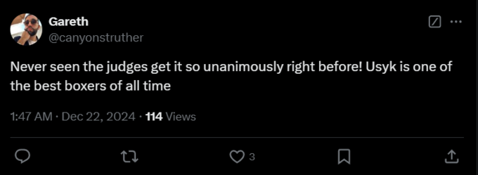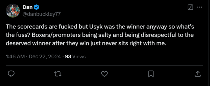 Dan: «Судейские карточки – это фигня, но Усик в любом случае победил, так что в чем суета? Когда боксеры/промоутеры ведут себя грубо и неуважительно по отношению к заслуженному победителю после его победы, это меня никогда не устраивает».