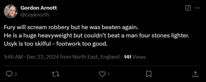 Gordon Arnott: «Фьюри будет кричать «грабеж», но его снова избили. Он огромный тяжеловес, но не смог победить человека, который весит меньше его на 24 кг. Усик слишком хорош в работе ног».