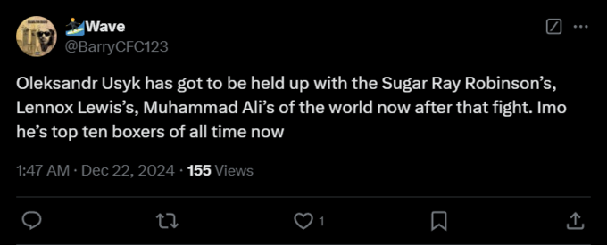 Wave: «После этого боя Усик заслуженно занимает место в ряду с величайшими, такими как Шугар Рэй Робинсон, Леннокс Льюис и Мухаммед Али. По моему мнению, он теперь точно в десятке лучших боксеров всех времен».
