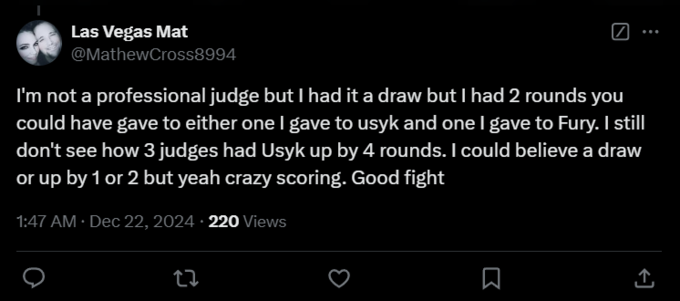 Las Vegas Mat: «Не претендую на звание профессионального судьи, но мне показалось, что это ничья. Были два раунда, которые можно было отдать одному или другому – я отдал их Усику, но мог бы и Фьюри. Так что я все еще в недоумении, как три судьи отдали Усику четыре раунда. Я бы понял ничью или победу с минимальным преимуществом, но вот такие сумасшедшие очки. Хороший бой».