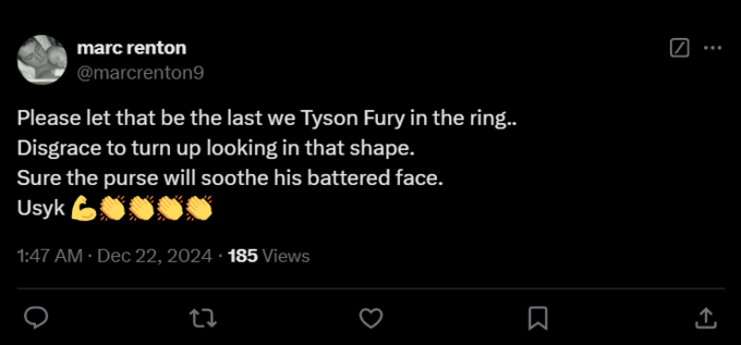 Marc renton: «Пожалуйста, пусть это будет последний раз, когда Тайсон Фьюри на ринге... Позор появиться в такой форме. Конечно, кошелек успокоит его избитое лицо. Усик – топ».