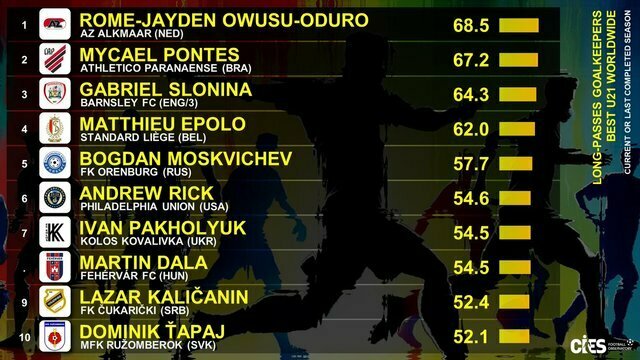 В рейтинге 20-летний футболист клуба из Ковалевки занял 7-е место на пару с кипером «Фехервара» Мартином Дала. Длинный пас обоих оценили в 54.5 балла из 100. Первое место топ занимает голкипер «АЗ» Ром-Джейден Овусу-Одуро с оценкой навыка в 68.5 из 100 возможных баллов.