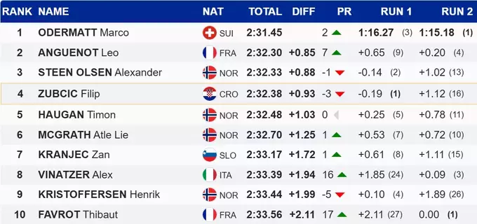 Во второй раз подряд победителем стал швейцарец Марко Одерматт, опередивший соперника Лео Ангело, занявшего вторую строчку, на 0.85 секунды. Интересно, что Лео впервые в карьере поднялся на подиум в рамках Кубка мира. Третьим оказался норвежец Александра Стеен Ольсен.