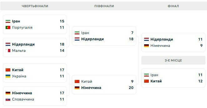 Ранее украинская команда заняла второе место в предварительной группе, обыграв ЮАР (19:8), но уступив Ирану (14:16). Затем сине-желтые уступили в 1/4 финала команде Китая со счетом 11:17.