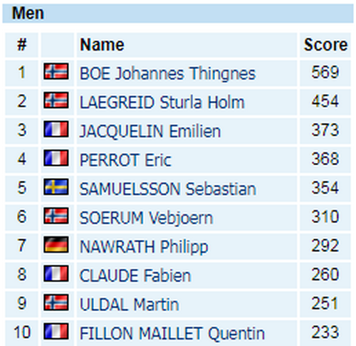 В общем зачете Кубка мира продолжает лидировать Йоханнес Бё. Его преимущество над Легрейдом составляет уже немалые 125 баллов. Двое французов, Эмильен Жаклен и Эрик Перро, конкурируют с Себастьяном Самуэльссоном за третью позицию. Из этих троих выше всех в масс-старте финишировал швед – только на 10-м месте.