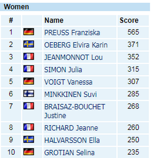 В общем зачете Кубка мира преимущество Франциски Пройсс над ближайшей конкуренткой, Эльвирой Эберг, составляет почти 200 очков. Удивляться нечему, ведь немка выступила во Франции блестяще, а Эберг и Лу Жанмонно в Анси, по своим меркам, провалились. Однако всё ещё может измениться в следующем календарном году.