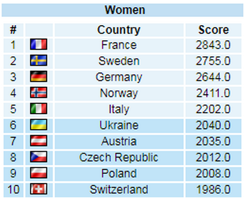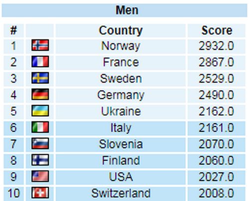 В Кубке наций лидеры остаются прежними: Франция, Швеция, Германия. Без Тандреволд продолжает увеличиваться разрыв между первой тройкой и сборной Норвегии.