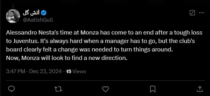 AatishGull: «Время Алессандро Несты в «Монце» подошло к концу после тяжёлого поражения от «Ювентуса». Всегда трудно, когда тренера увольняют, но руководство клуба явно посчитало, что смена необходима для того, чтобы изменить ситуацию. Теперь «Монца» будет искать новое направление».