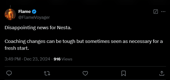Flame: «Плохие новости для Несты. Смены тренеров могут быть трудными, но иногда их считают необходимыми для нового старта».