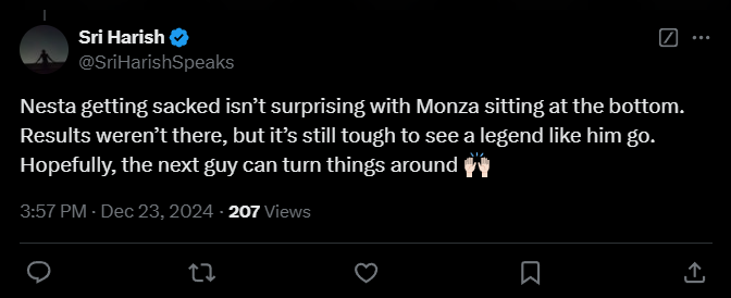 Sri Harish: «Увольнение Несты не удивляет, учитывая, что «Монца» находится на последнем месте. Результатов не было, но всё равно тяжело видеть, как уходит такая легенда. Надеюсь, следующий тренер сможет изменить ситуацию».