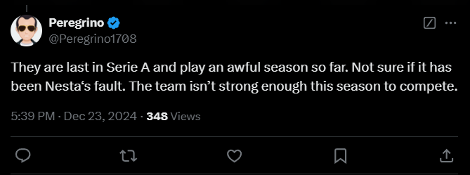 Larrylurex86: «Справедливо, он был одним из величайших защитников всех времён, но если взглянуть на таблицу, видно, что он ещё не готов к карьере тренера. Жаль это видеть, но это правда! В остальном Алессандро Неста остаётся невероятным человеком».