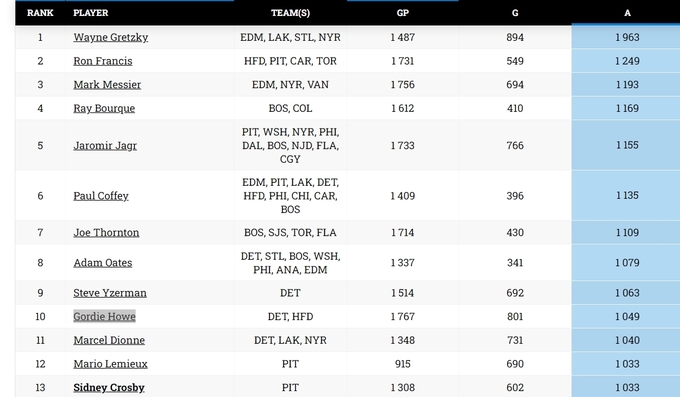 И уже в этом сезоне игрок может войти в топ-10 в истории Лиги – у Горди Хоу, который находится на десятой позиции, 1049 ассистов.