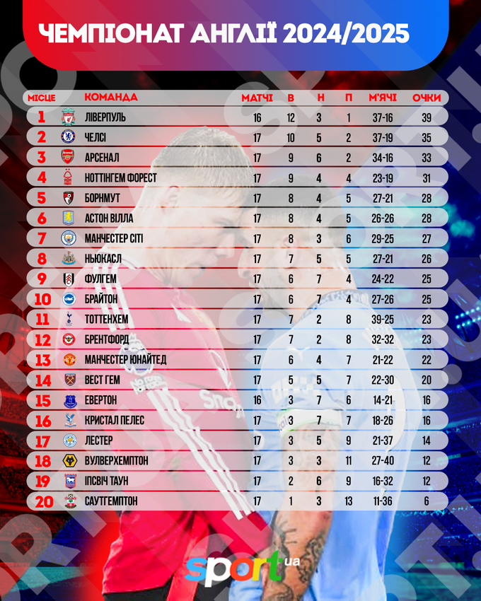 Топ-8 АПЛ: Ливерпуль (39 очков), Челси (35), Арсенал (33), Ноттингем Форест (31), Борнмут (28), Астон Вилла (28), Ман Сити (27), Ньюкасл (26).