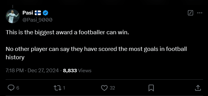 Pasi: «Это самая большая награда, которую может получить футболист. Ни один другой игрок не может сказать, что забил больше всех голов в истории футбола».
