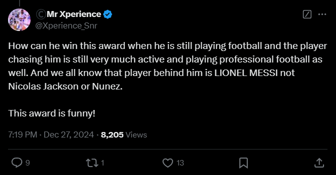 Mr Xperience: «Как он может получить эту награду, когда он всё ещё играет в футбол, а игрок, который преследует его, тоже продолжает карьеру на профессиональном уровне? И все мы знаем, что этот игрок – Лионель Месси, а не Николас Джексон или Нуньес. Эта награда смешная!».