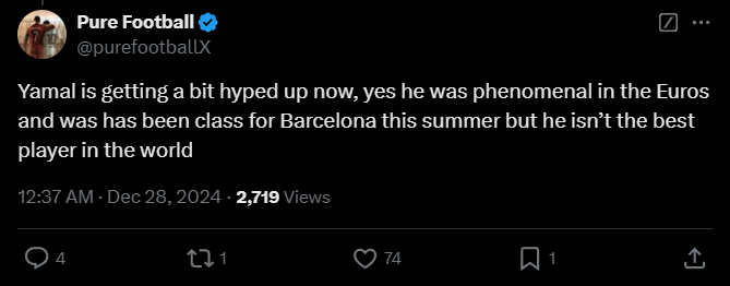 Pure Football: «Ямал немного переоценен сейчас, да, он был феноменален на Евро и показывал класс за «Барселону» этим летом, но он не лучший игрок в мире».