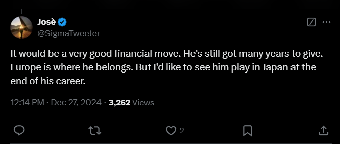 Jose: «Это был бы очень выгодный финансовый шаг. У него еще много лет, чтобы играть. Европа вот где ему место. Но в конце карьеры хотелось бы увидеть его в Японии».