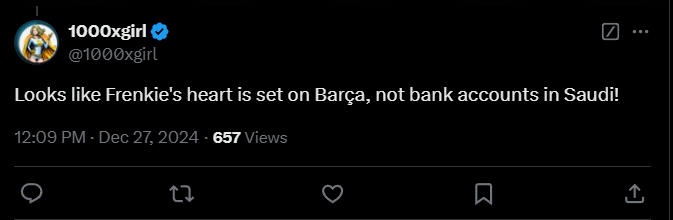 Болельщики «Барселоны» поддержали решение Френки остаться, но некоторые все еще считают, что он упустил шанс перейти в «Манчестер Юнайтед».
