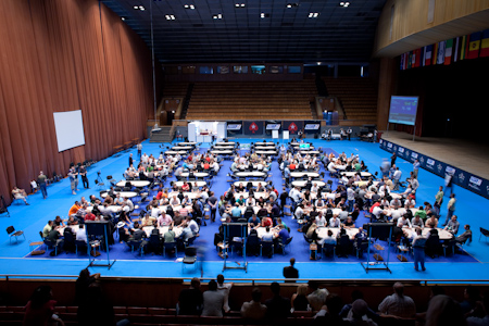На огромной арене киевского Дворца спорта за 50 столами под 17-тиметровым потолком продолжается День 1a Главного события PokerStars EPT Kyiv. Более 100 игроков остаются в игре. Беспрестанный, звонкий и многократно отражаемый шорох фишек изредка прерывается сообщениями о смене уровней. Почти сотня журналистов со всего мира упорно трудится в пресс-руме, отделенном от игрового зала высокой ширмой. Из-за лэптопов доносится низкий и упругий звук нажимаемых клавиш. Работают затворы десятков фотокамер.