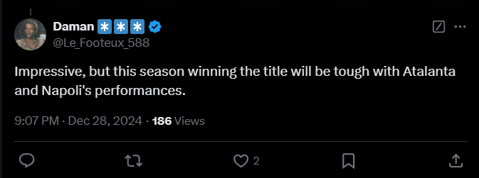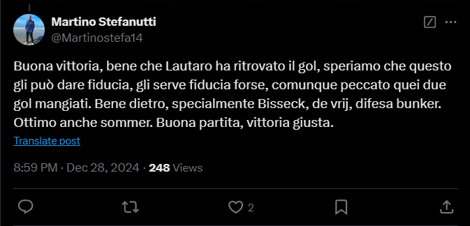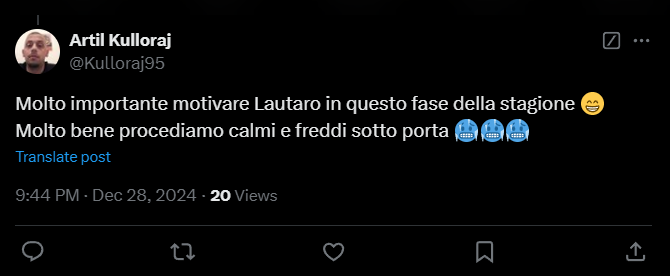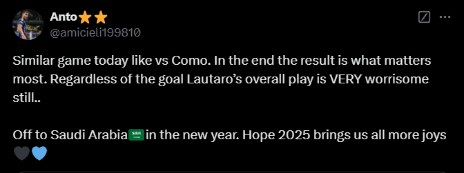 Anto: «Похожая игра сегодня, как против «Комо». В конце концов, результат это самое главное. Несмотря на гол, игра Лаутаро в целом очень настораживает... Отправляемся в Саудовскую Аравию в новом году. Надеюсь, 2025 год принесет нам всем больше радости».