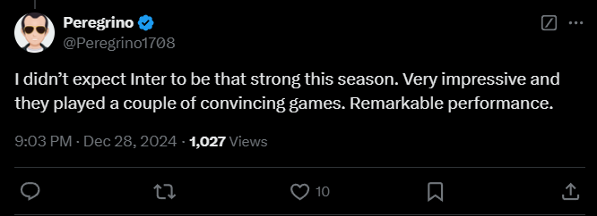 Peregrino: «Не ожидал, что «Интер» будет таким сильным в этом сезоне. Очень впечатляюще, и они провели несколько уверенных матчей. Замечательное выступление».