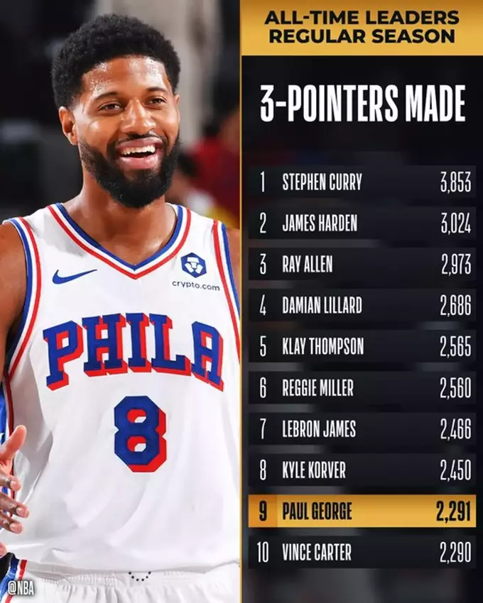 34-летний форвард «Филадельфии» Пол Джордж вошел в десятку лучших игроков по количеству реализованных трехочковых в регулярном чемпионате НБА.
