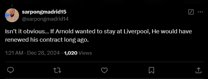 Sarpongmadrid15: «Разве это не очевидно... Если бы Арнольд хотел остаться в «Ливерпуле», он бы уже давно продлил свой контракт».