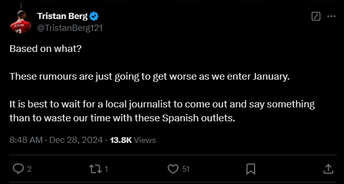 Tristan Berg: «На чем основано это? Эти слухи только будут усиливаться, когда мы войдем в январь. Лучше подождать, когда местные журналисты что-то скажут, чем тратить время на эти испанские издания».